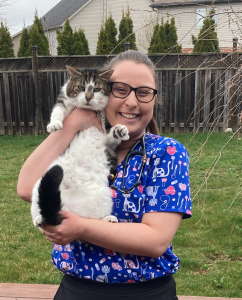 Outside of veterinary medicine she has volunteered at cat rescue agencies and has owned a wide variety of animals throughout her life including hamsters, rats, hermit crabs, fish, a parakeet, a tortoise, a snake, cats, and dogs. She currently has two cats, Nala and Josie.